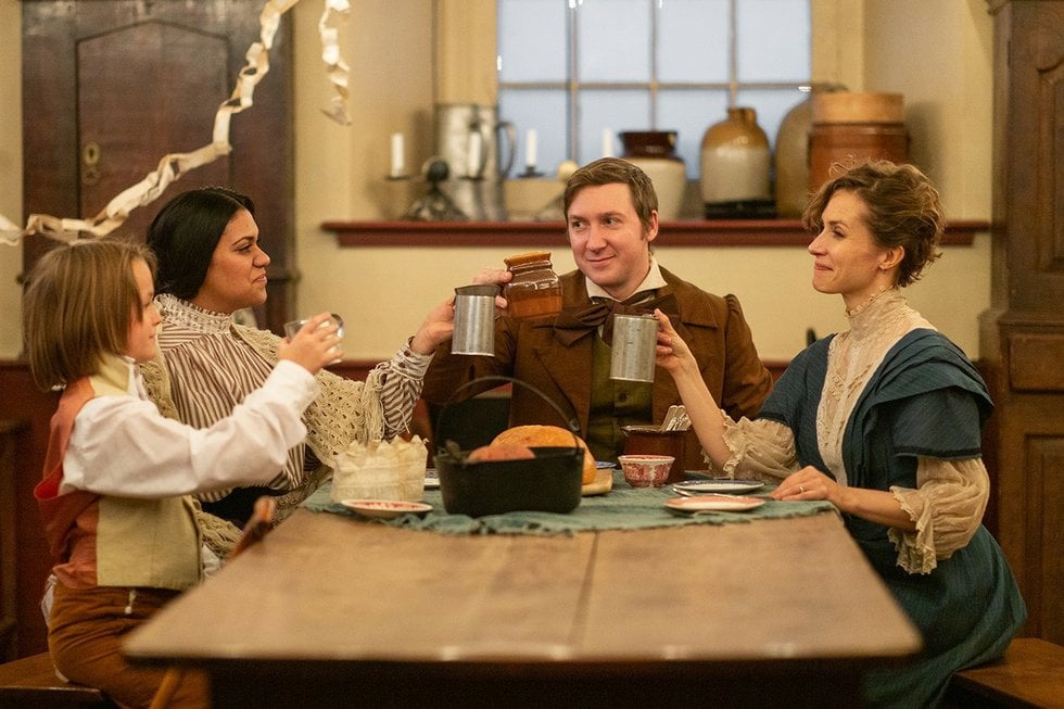 Haigh’s additions are brilliant. They range from the identities of two donation-seekers (I think Dickens would approve of the names Bailiwick and Barleycorn) to a salty, innuendo-filled party song (with music by Pratik Gandhi) that adds liveliness to the middle of the play. References to workplace safety and foreclosures have contemporary relevance. And yet a phrase like “Alice is a companion, not a coin purse,” feels era appropriate.