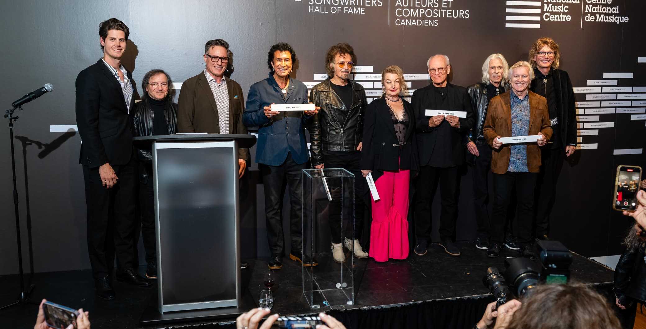 There was a brief break to play two videos, one on the National Music Centre (NMC), Canada’s version of the Rock and Roll Hall of Fame, mentioning that the inductees received their Hall of Fame plaques at a pre-show reception that will be on display forever at the NMC; the other spotlighting Palestinian-Canadian artist Nemahsis, winner of the Breakthrough Songwriter of the Year award, which “celebrates emerging artists and songwriters we hope to see standing on this very stage in the years to come,” Slone said.