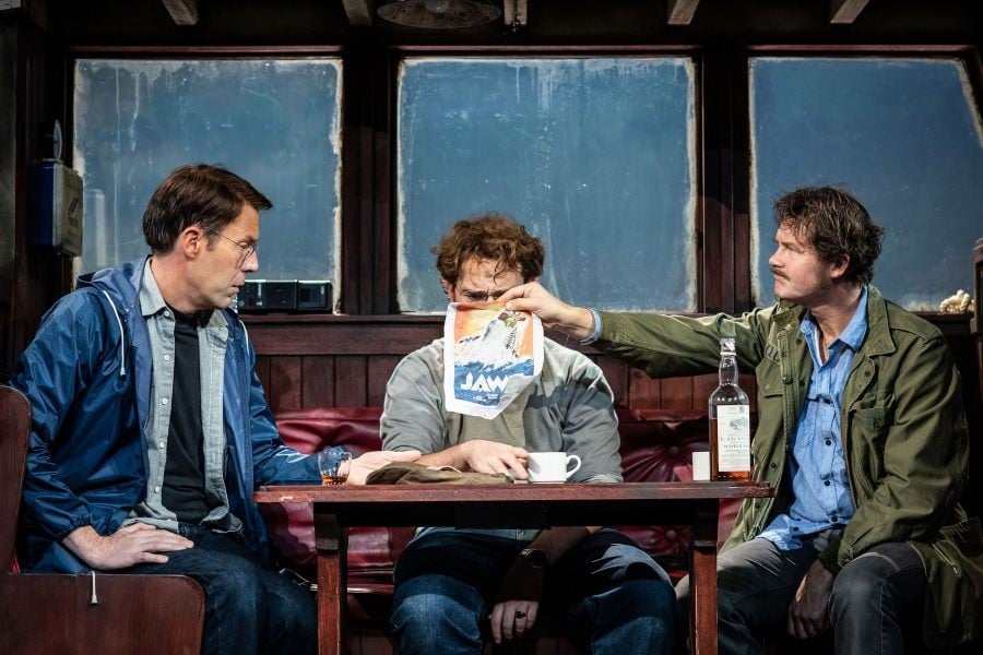 In real life, the three got to wait things out, and grumble, in their hotel rooms on Martha’s Vineyard. In Ian Shaw and Joseph Nixon’s unconvincing setting, however, they’re marooned on the film’s boat (a decent enough replica designed by Duncan Henderson), passing the time by playing games, drinking, discussing their careers and wondering if the film they’re making will be any good.
