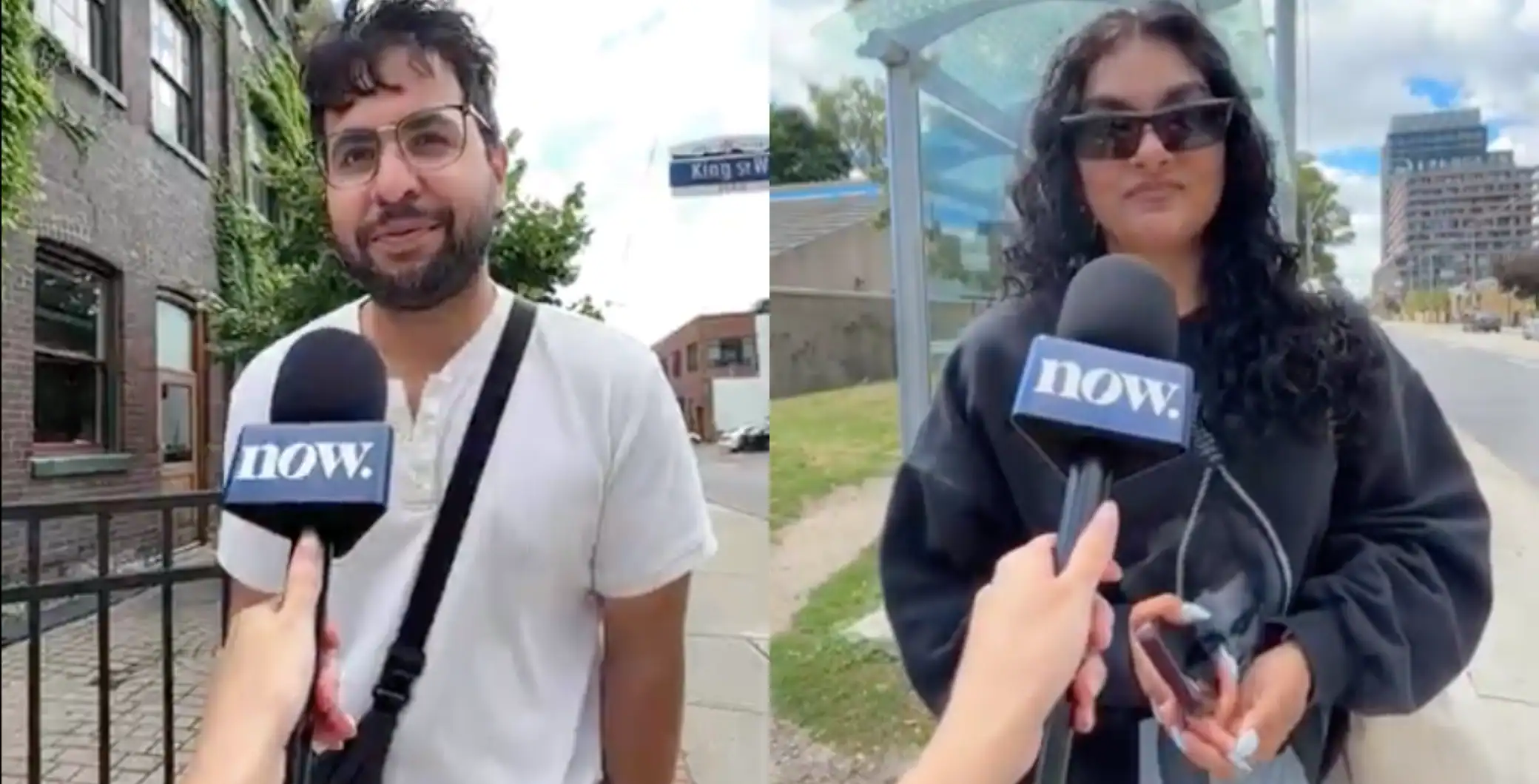 Diverse Toronto residents giving interviews outdoors in the city on a cloudy day, showcasing multicultural community and vibrant urban life.