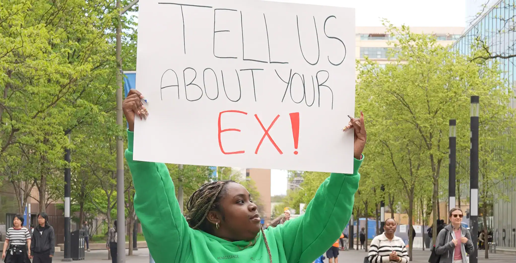 Holding up a bristle board sign reading “Tell us about your ex” in the heart of downtown, Now Toronto invited strangers to stop and vent about their past relationships for the latest edition of This is Dating Now. What followed was a spontaneous outpouring of stories– some messy, some painful, and many completely unbelievable!