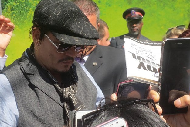 “I will sign as many autographs and take as many photos as I can, as long as there is no pushing,” Depp says. “If there is pushing, my man Bill here will take your things and kick you out. So please everyone, be mindful, and thank you…”