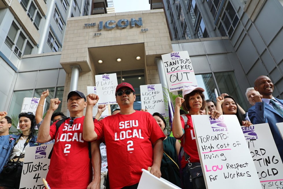 A rally was held on July 24 to support five janitors who have been locked out of their jobs at the Icon Condominiums at 250 and 270 Wellington West.
