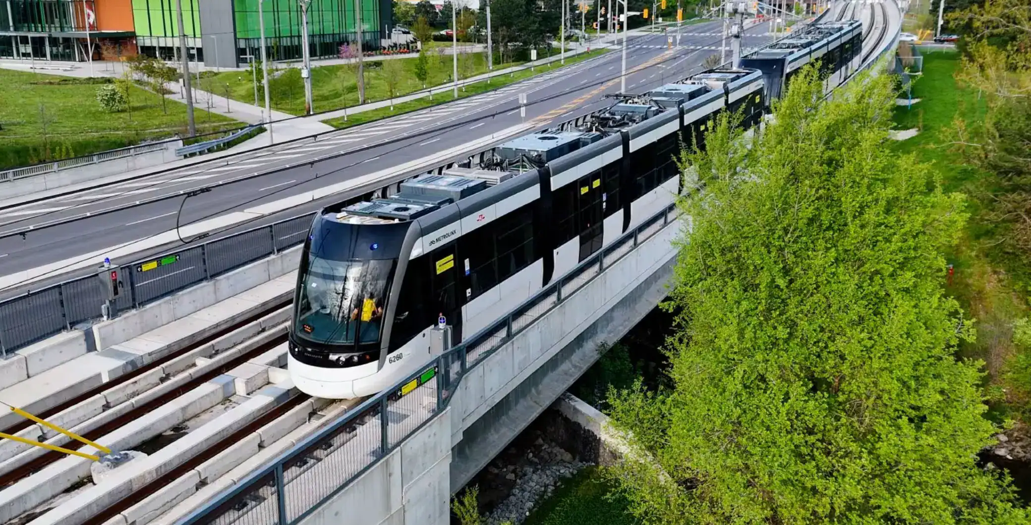 Metrolinx says that track installation has been completed at most intersections and along much of the guideway. Recent work includes track reinstallation at Topflight Drive and four other major intersections, restoring full access to road users.