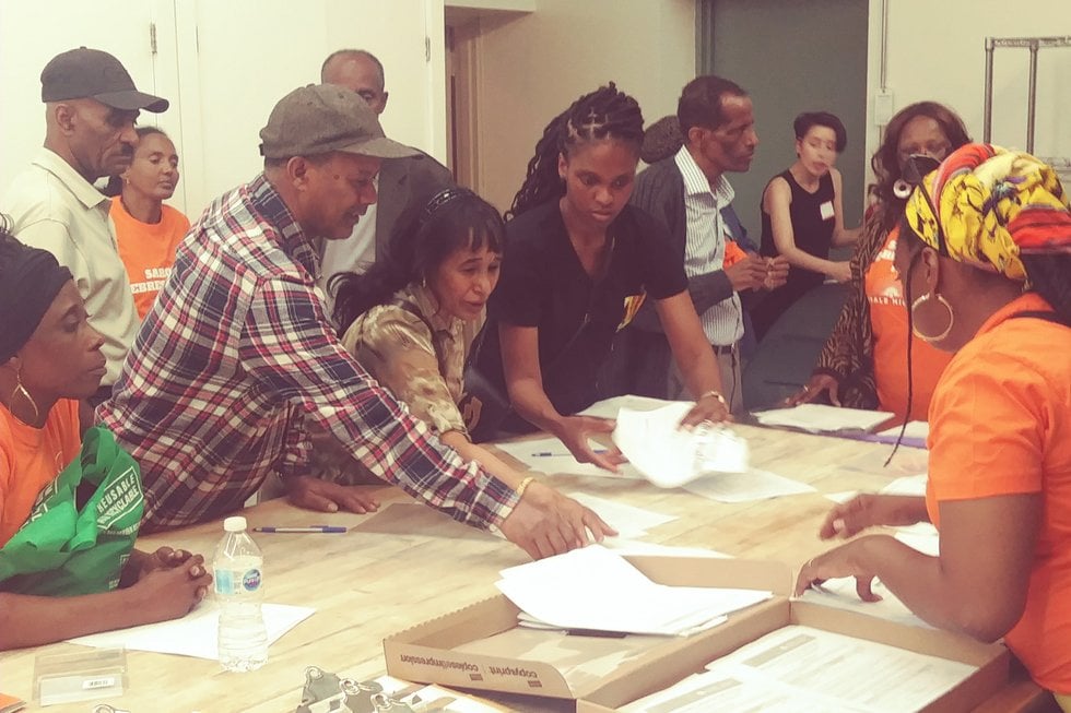 The mostly African immigrants who came to support Gebresellassi were forced to stand in a long line as representatives from the national party office were on site to “verify” whether these community members were eligible to vote.