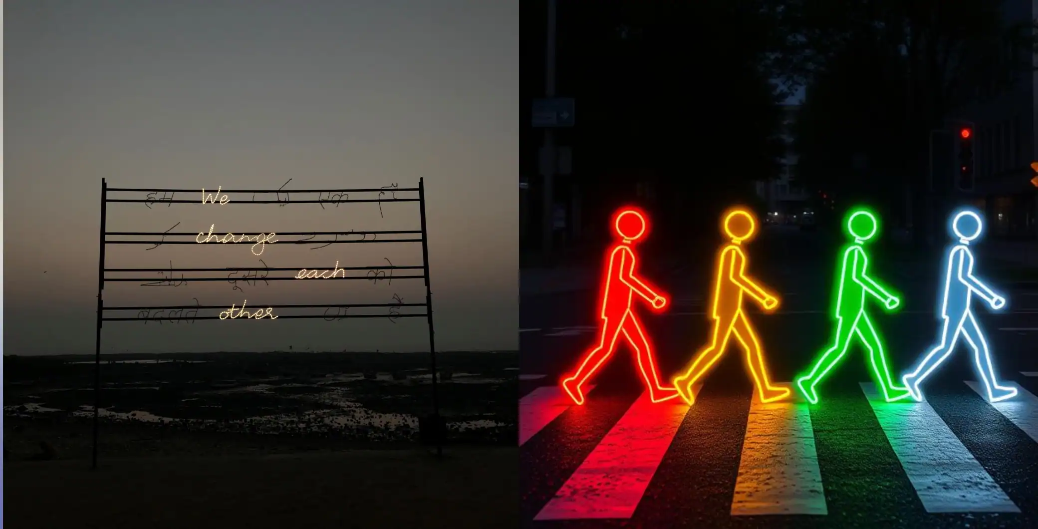 Designed by Indian artist Shilpa Gupta, We Change Each Other, is a light installation featuring the title phrase in Hindi, Arabic, and English.