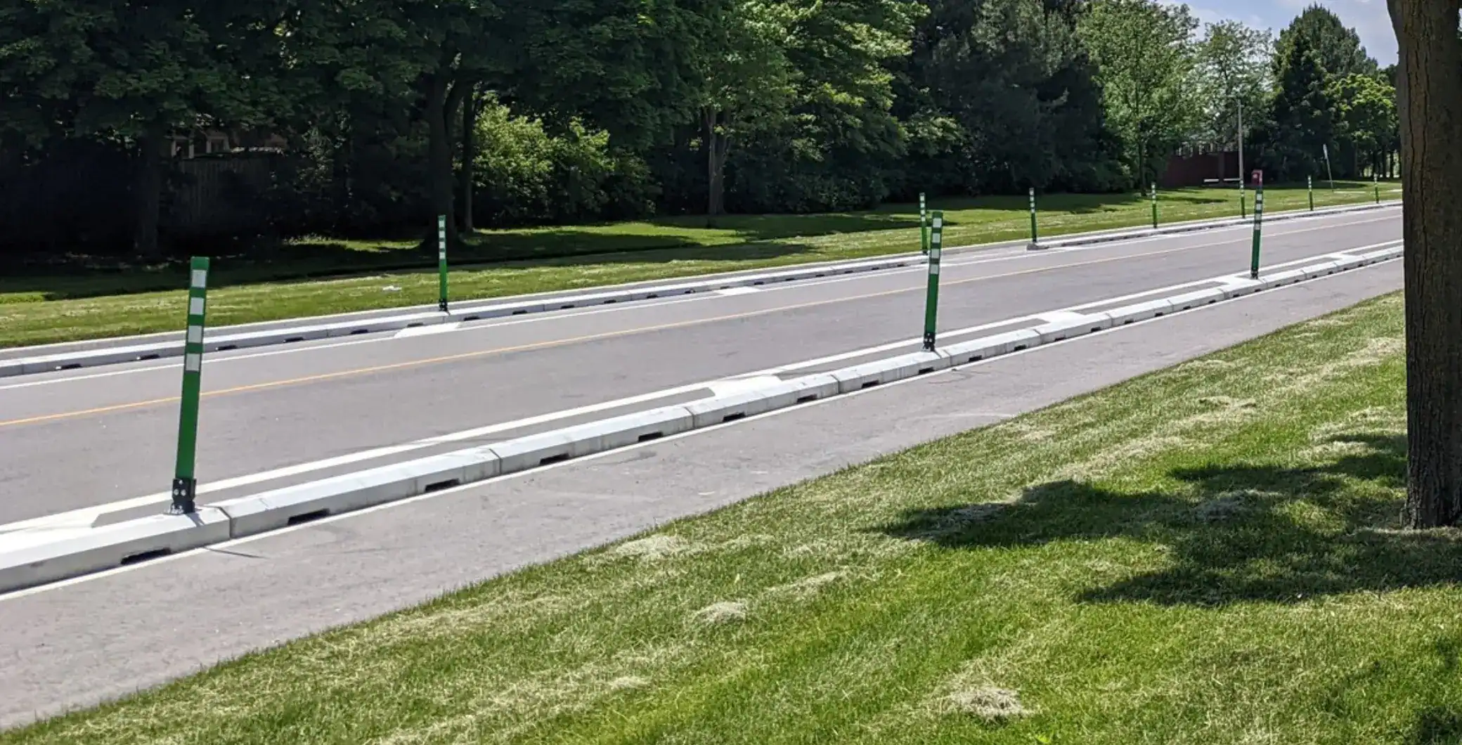The bike lanes, installed in 2021 and later supplemented with concrete barriers in 2023, run along Howden Boulevard and form part of Brampton’s only continuous east-west active transportation corridor south of Bovaird Drive. The route connects Vodden Street in the west to Hanover Road in the east.