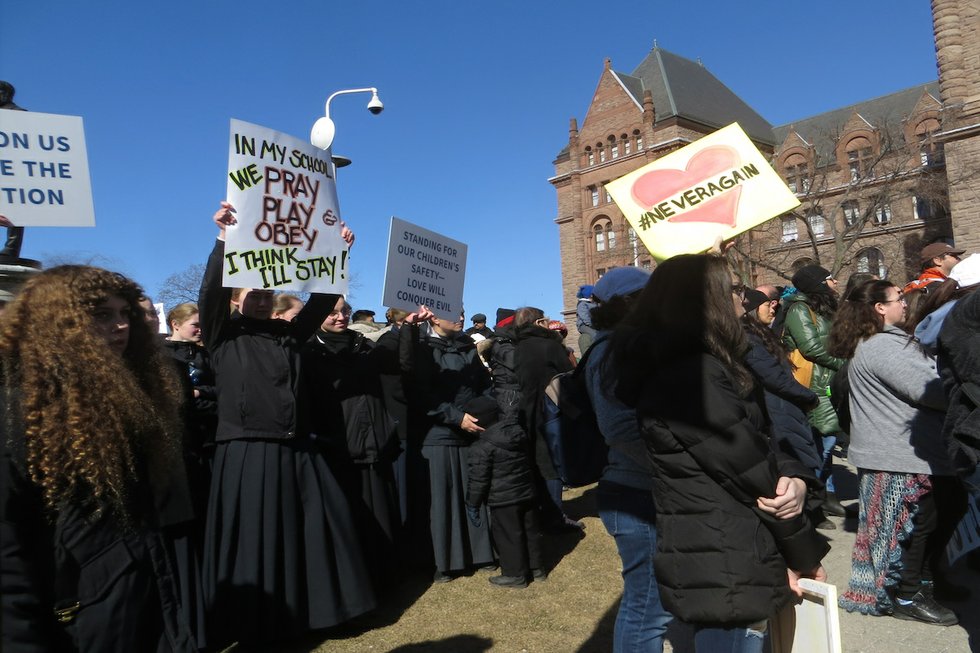 “After the shooting in Parkland, I saw Emma Gonzalez’s speech and I was really affected by it. I started thinking about it, and when I heard about the march happening in Washington, DC today, I wanted to go. We couldn’t so we decided to start our own here in Toronto. There are over 2,000 people here! Every month or two at my school we have a lock-down drill in case something like this (Stoneman) happens. It’s fine for safety, but the fact that we have to do it is a little unsettling.”