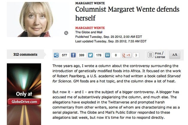 Wente, who has been writing for the Globe since 1992 and is a past winner of a National Newspaper Award, became the centre of an online firestorm last week, after a critical blog post by Ottawa University visual art professor Carol Wainio. On her Media Culpa blog, Wainio documented similarities between a 2009 op-ed by Wente about African agriculture and seven other texts, including stories in the Ottawa Citizen, Newsweek, and New York Times.