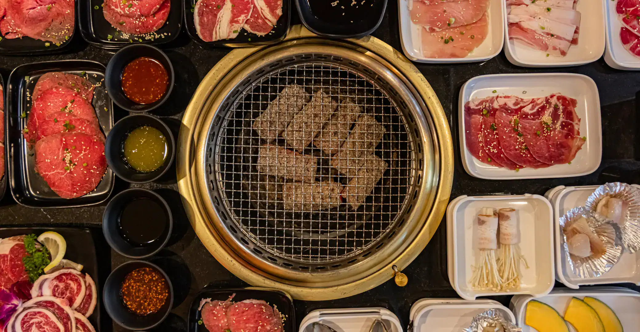 Barbecuers can expect a wide selection of seasoned meats, several kinds of banchan (side dishes), and the satisfying sounds of sizzling grills throughout the restaurant.